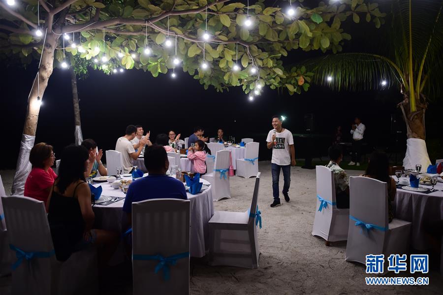 12月7日,在印度尼西亞邦加勿里洞省李王島,李嘉文在沙灘晚宴開(kāi)始前向游客致辭。 新華社記者杜宇攝