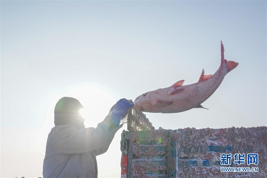 12月27日,在查干湖冰面上,工人將剛打撈上來(lái)的大魚(yú)扔上貨車。新華社記者張楠攝