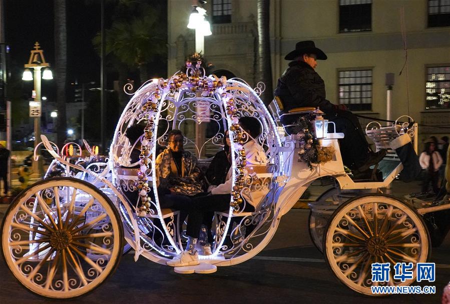 12月29日,人們在美國加利福尼亞州里弗賽德燈光節(jié)上乘坐馬車。 新華社記者李穎攝