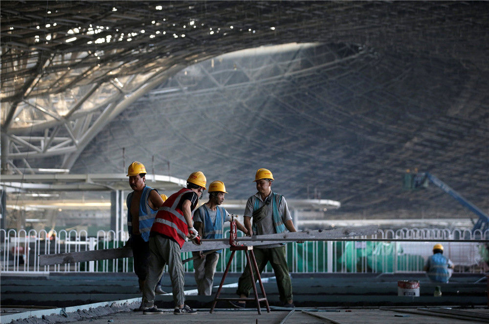 工人在北京大興國(guó)際機(jī)場(chǎng)主航站樓內(nèi)進(jìn)行裝修施工(2018年12月29日攝)。新華社記者鞠煥宗攝