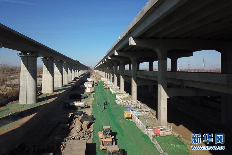 這是建設(shè)中的北京大興國(guó)際機(jī)場(chǎng)高速公路和北京軌道交通新機(jī)場(chǎng)線(2018年12月29日無(wú)人機(jī)拍攝)。新華社記者鞠煥宗攝