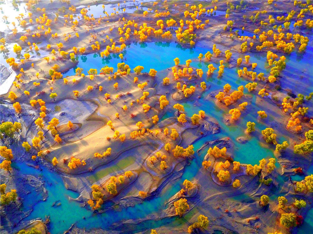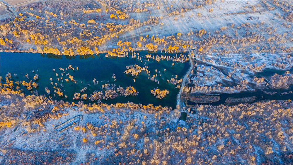 2016年11月2日,航拍的新疆塔里木河尉犁縣段胡楊林。胡熱/視覺中國(guó)