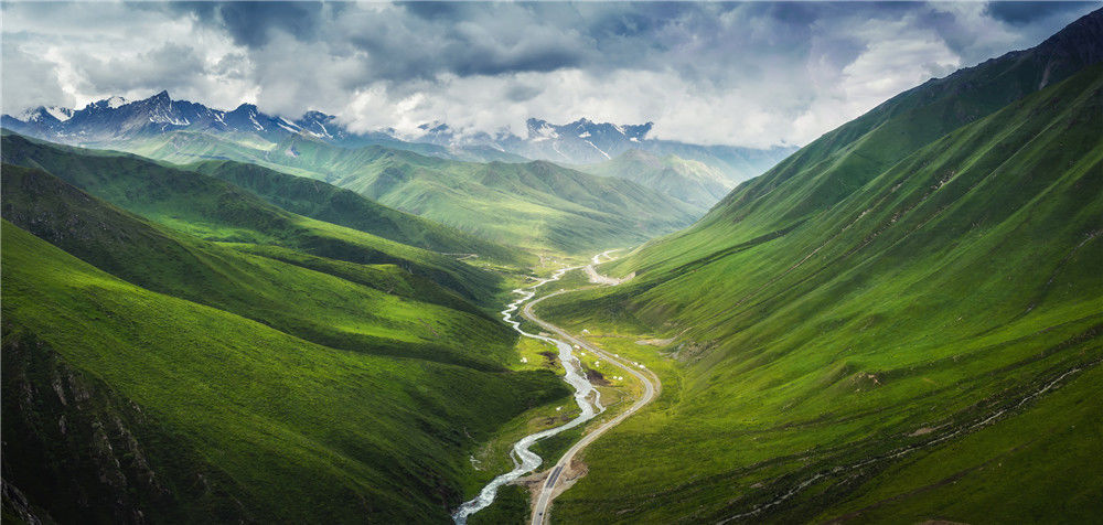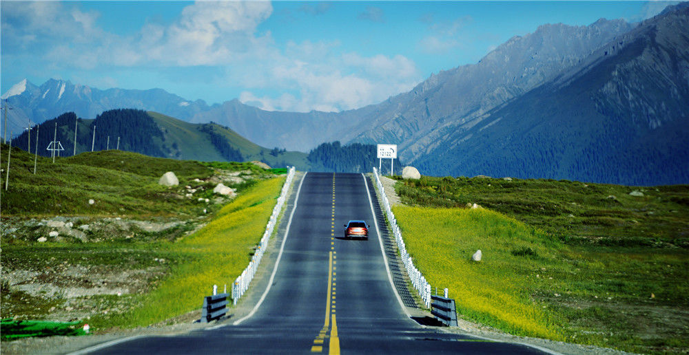 2019年7月10日,新疆獨(dú)庫(kù)公路蜿蜒在天山山脈的草原山谷中。黃光浩/視覺中國(guó)