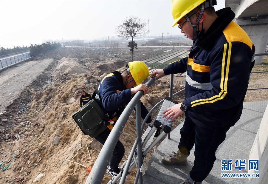1月3日,中國鐵路濟南局臨沂工務段工程技術員準備對沂河特大橋橋墩進行檢查。新華社記者 朱崢攝