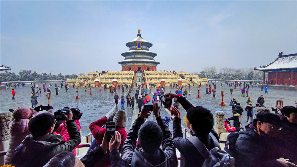 2019年11月30日,北京,初雪過后,天壇公園銀裝素裹,白雪古建相互映襯,景色迷人。天壇公園里觀雪賞景的市民絡(luò)繹不絕。喬?。垐D像/視覺中國