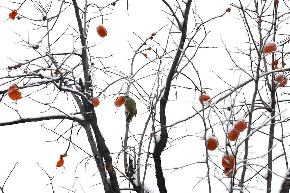2019年11月30日,雪后的北京天壇公園內(nèi),鳥兒在柿子樹上覓食。29日,北京迎來2019年冬季初雪。富田(攝影部)/中新社/視覺中國