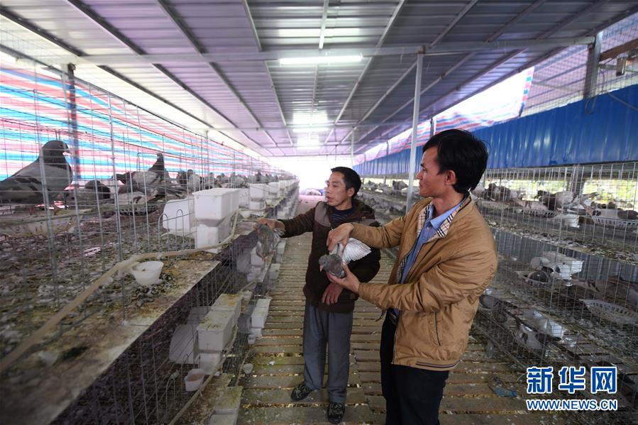 八好村駐村第一書(shū)記韋德王(右)在扶貧養(yǎng)殖場(chǎng)了解乳鴿的生長(zhǎng)情況(2019年12月16日攝)。新華社記者黃孝邦攝