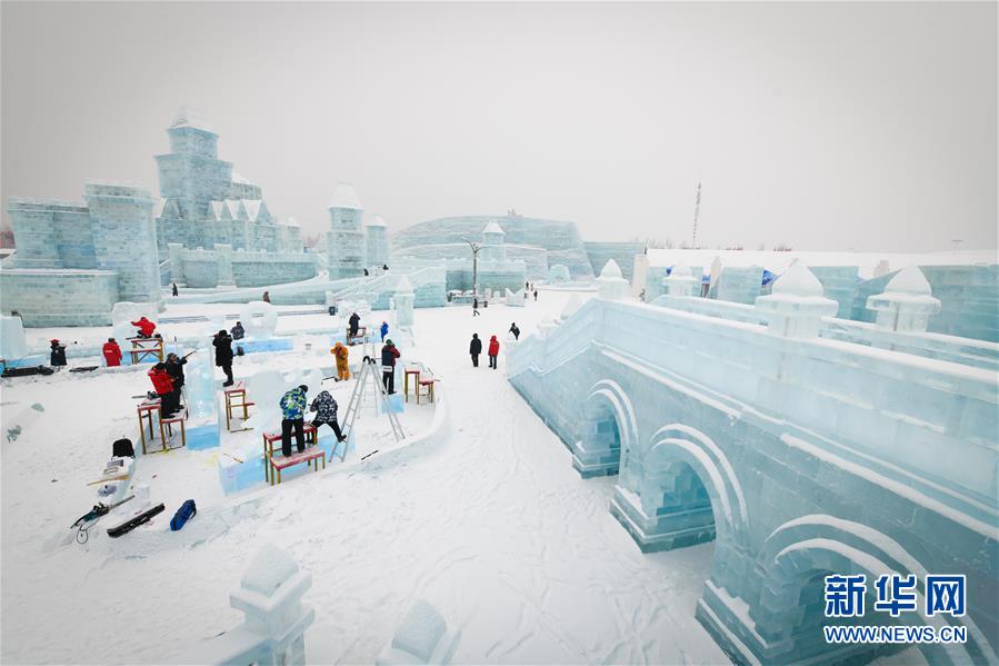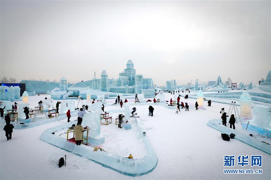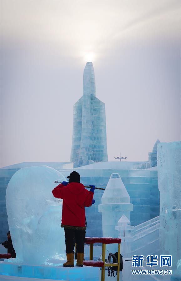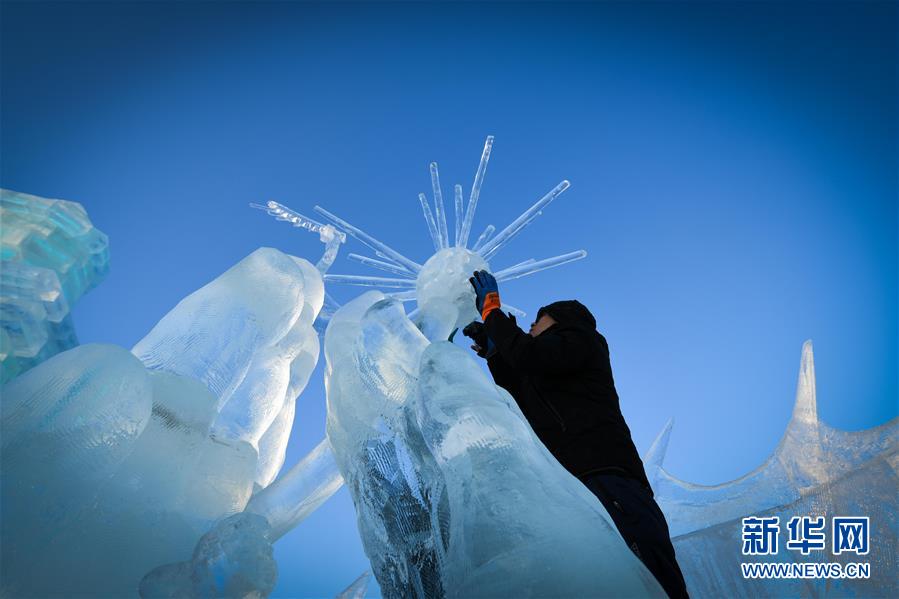 第九屆中國(guó)·哈爾濱國(guó)際組合冰雕比賽選手在哈爾濱冰雪大世界內(nèi)制作冰雕(1月2日攝)。新華社記者王松攝