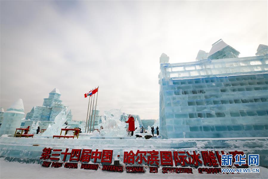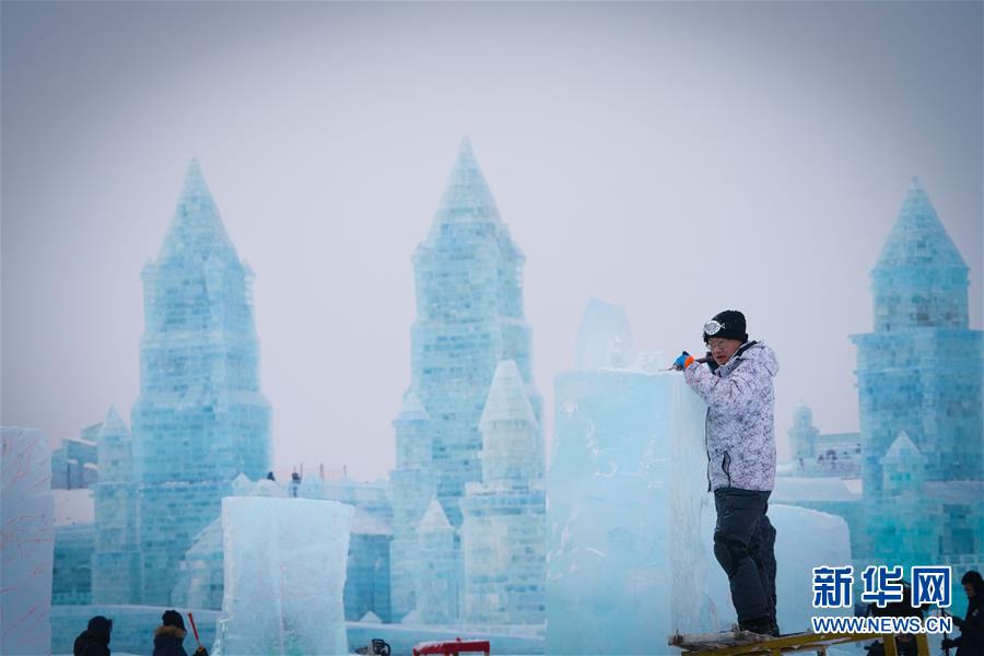 第九屆中國(guó)·哈爾濱國(guó)際組合冰雕比賽選手在哈爾濱冰雪大世界內(nèi)制作冰雕(1月2日攝)。新華社記者王松攝