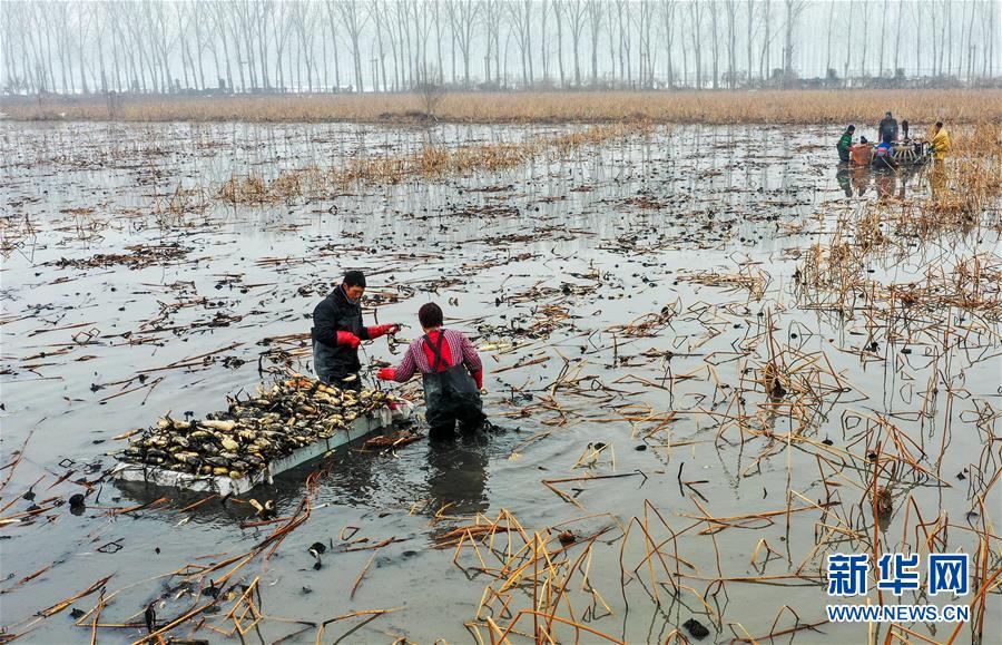 1月10日,村民在磁縣禾下土白蓮藕立體種養(yǎng)基地采收蓮藕(無人機照片)。新華社記者 王曉 攝