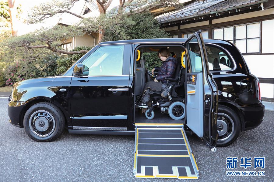 1月10日,在日本東京,一名殘障人士試乘倫敦電動汽車公司的電動出租車TX。 新華社記者 杜瀟逸 攝