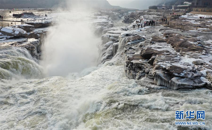 1月12日拍攝的黃河壺口瀑布的“水底冒煙”景觀(無人機照片)。新華社記者陶明攝