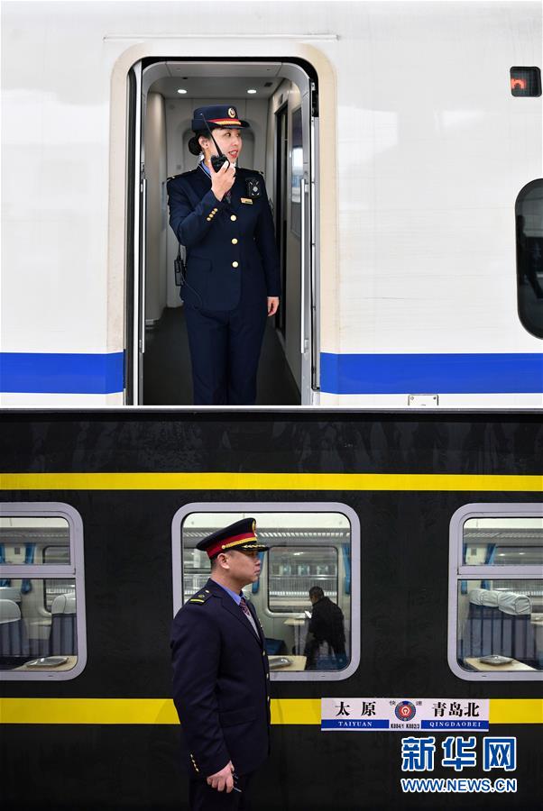 拼版照片上圖:在運(yùn)城北站,列車長(zhǎng)陳海燕確認(rèn)旅客上車后通過對(duì)講機(jī)通知司機(jī)關(guān)閉車門(新華社記者詹彥1月11日攝);下圖:在太原站,列車長(zhǎng)趙耀在列車出發(fā)前檢查巡視(新華社記者楊晨光1月11日攝)。新華社發(fā)