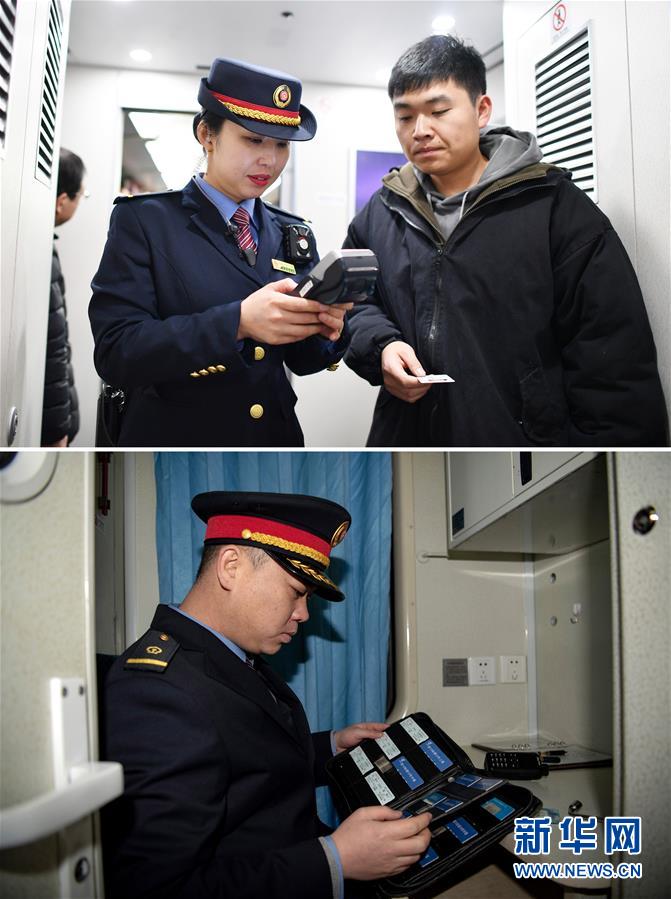 拼版照片上圖:在太原南開往西安北的D2507次列車上,列車長(zhǎng)陳海燕(左)幫助乘客辦理補(bǔ)票業(yè)務(wù)(新華社記者詹彥1月11日攝);下圖:在陽泉北站,列車長(zhǎng)趙耀在查看臥鋪車票(新華社記者楊晨光1月11日攝)。新華社發(fā)