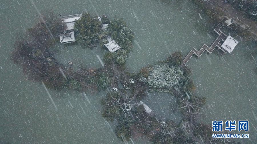 1月15日,幾名游客在雪中的合肥市包公園參觀(無(wú)人機(jī)照片)。 當(dāng)日,安徽省合肥市迎來(lái)降雪天氣。雪中的合肥市包公園景色別致。 新華社記者 張端 攝