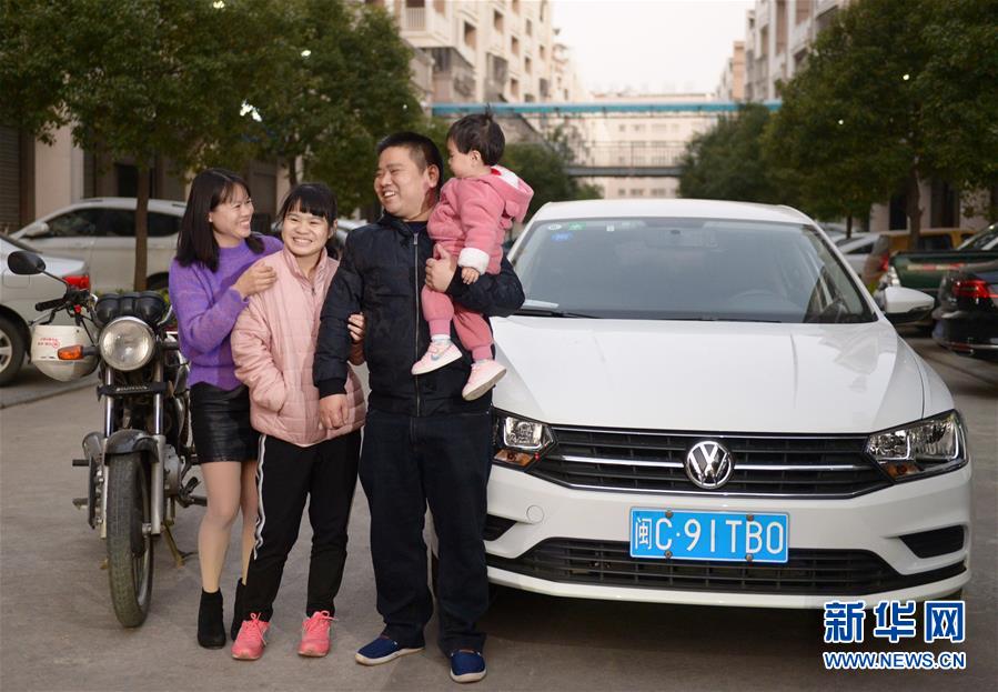 1月14日,在福建省晉江市一家服裝廠宿舍區(qū),董日旭(右二)和家人合影,一邊是他以前返鄉(xiāng)騎的摩托車,另一邊是他新買(mǎi)的汽車。