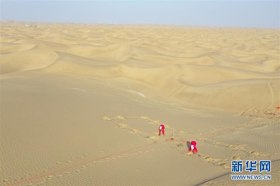 放線女工在塔克拉瑪干沙漠腹地進行放線工作(無人機照片,1月14日攝)。