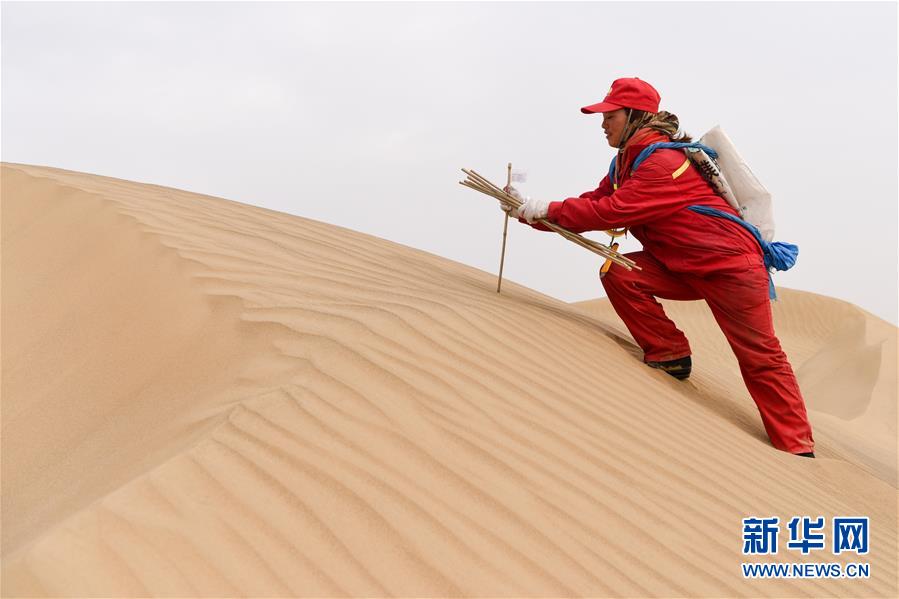測量工周國燕在測線上布設(shè)炮點(diǎn)樁號(1月13日攝)。 新華社記者 丁磊 攝
