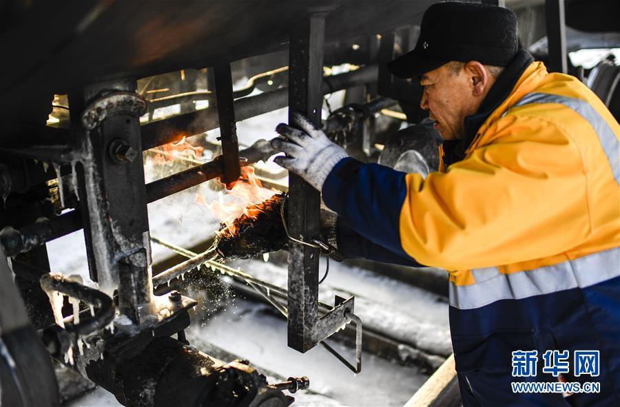 因?yàn)槎緶囟冗^(guò)低,送水員黃衛(wèi)東在蓄水前需要提前加熱閥門(mén)(1月17日攝)。新華社記者 許暢 攝