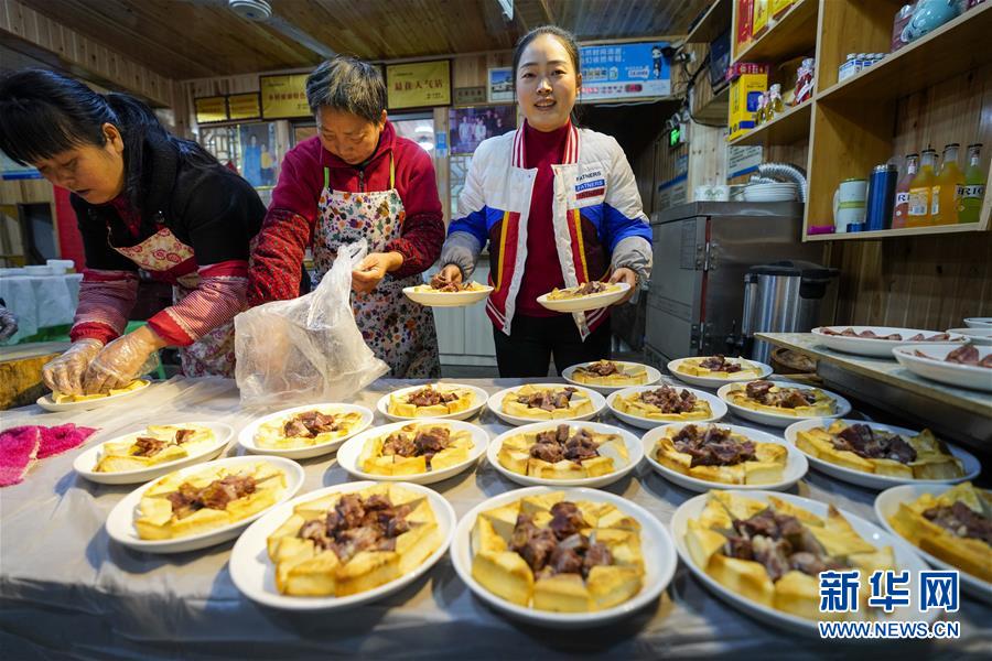 1月18日,中山古鎮(zhèn)的一戶商家在“千米長宴”開席前準(zhǔn)備菜品。新華社記者劉潺攝