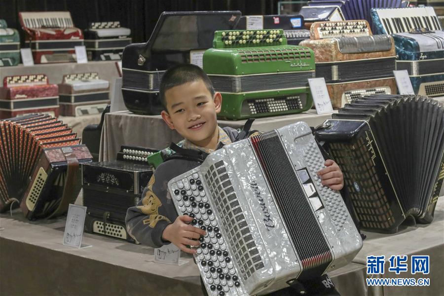在塔城市手風(fēng)琴博物館,當(dāng)?shù)匾幻∨笥褳橛慰脱葑嗍诛L(fēng)琴(1月21日攝)。新華社記者 趙戈 攝