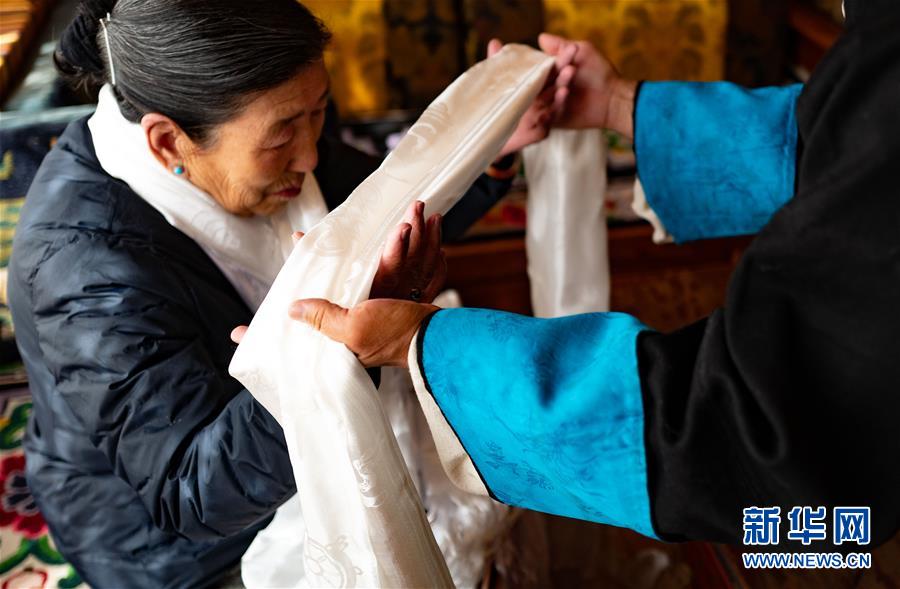 一名藏族群眾給長輩敬獻(xiàn)哈達(dá),祝福長壽(2月24日攝)。  新華社記者 普布扎西 攝
