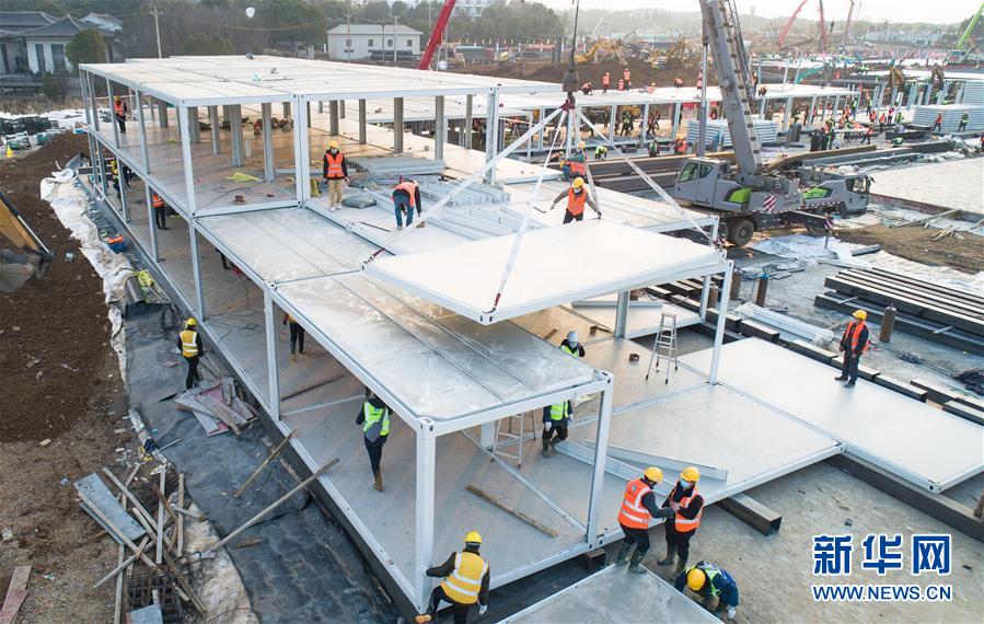 在武漢火神山醫(yī)院建設(shè)工地,來自中建三局的工人在加緊施工(1月28日攝,無人機照片)。 新華社記者 肖藝九 攝