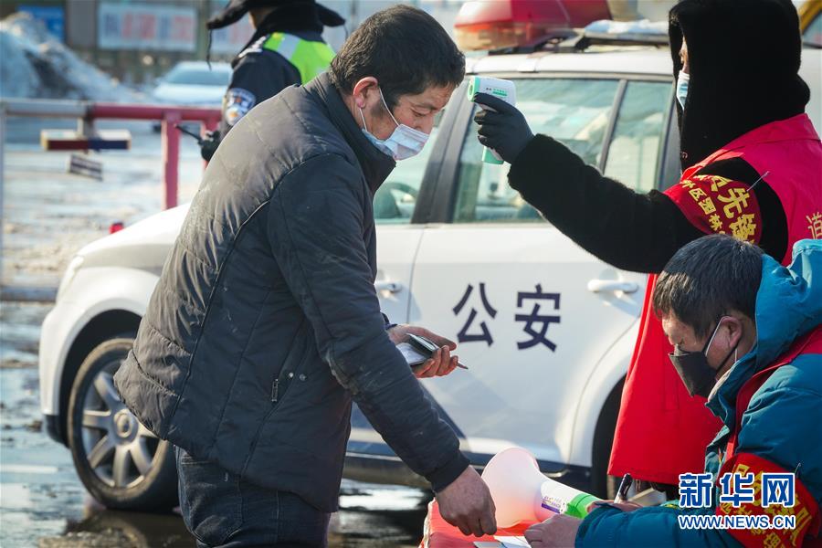 2月24日,工作人員在哈同高速公路哈爾濱收費站為車輛人員登記、測體溫。 新華社記者 王松 攝