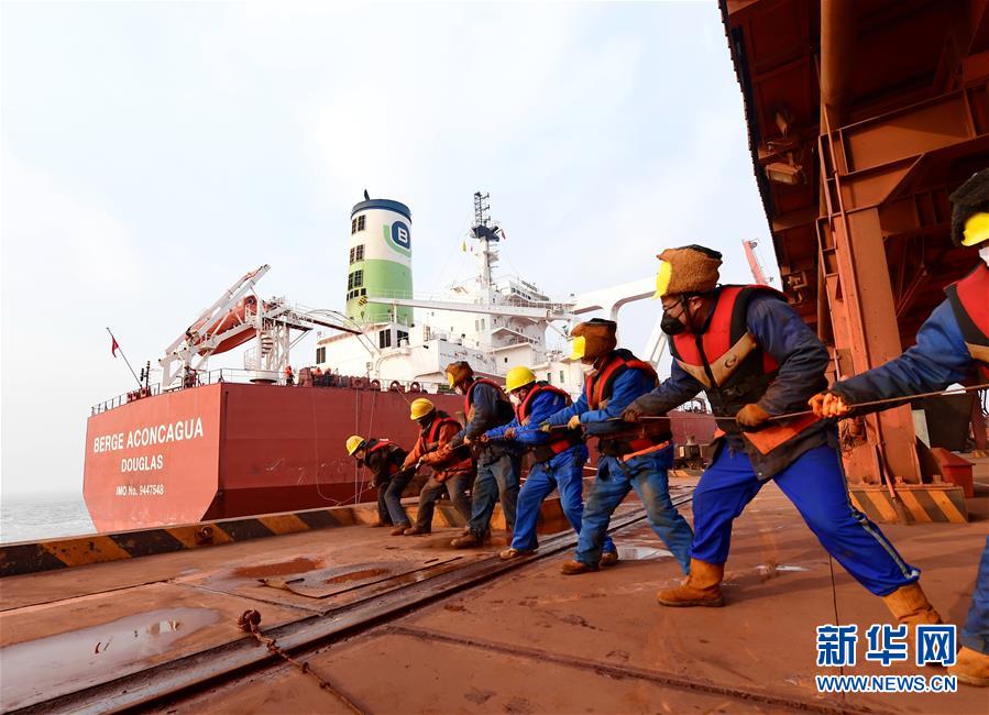 2月24日,在曹妃甸港區(qū)礦石碼頭,工人在為一艘靠岸的40萬噸級輪船拴掛纜繩。 連日來,河北省唐山港曹妃甸港區(qū)為有效防控疫情、保證安全生產(chǎn),采取對進(jìn)入港區(qū)人員檢測體溫、對車輛進(jìn)行消殺等嚴(yán)格措施,為海、陸交通暢通和物資運輸提供保障。 新華社記者 楊世堯 攝