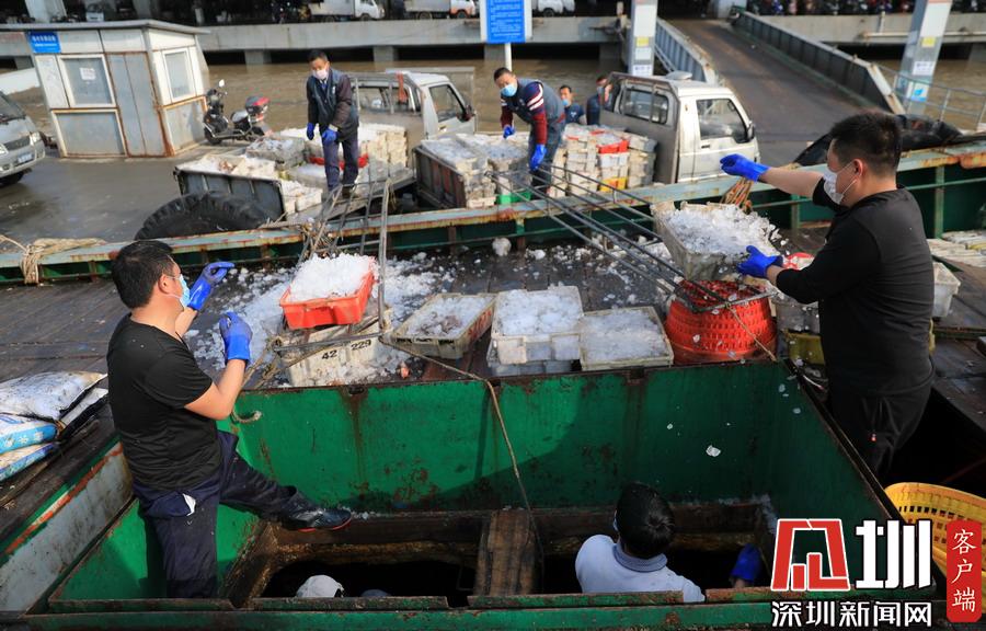2020年2月24日,浙江舟山國際水產(chǎn)城碼頭,當(dāng)?shù)氐墓と苏趧偪堪兜臐O船上卸魚貨,現(xiàn)場十分繁忙。