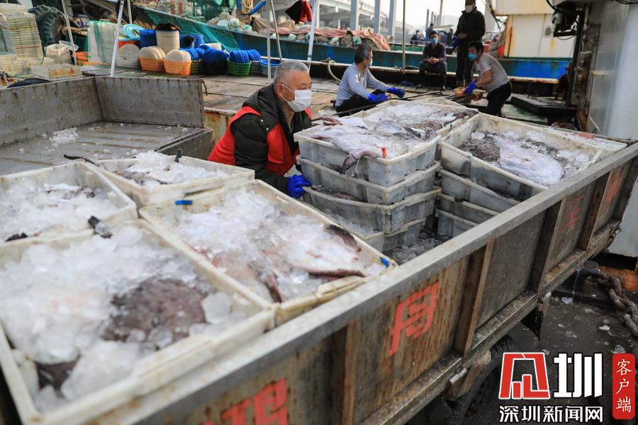 2020年2月24日,浙江舟山國際水產(chǎn)城碼頭,當(dāng)?shù)氐墓と苏趧偪堪兜臐O船上卸魚貨,現(xiàn)場(chǎng)十分繁忙。