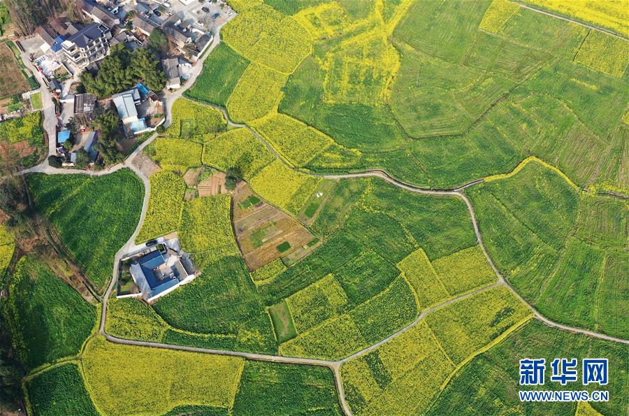 2月25日在四川省崇州市農(nóng)業(yè)產(chǎn)業(yè)功能區(qū)拍攝的油菜花田(無人機照片)。 初春時節(jié),正值農(nóng)時。成都平原西部的大邑、崇州等縣市油菜長勢良好,一片生機盎然的景象。 新華社記者 王曦 攝