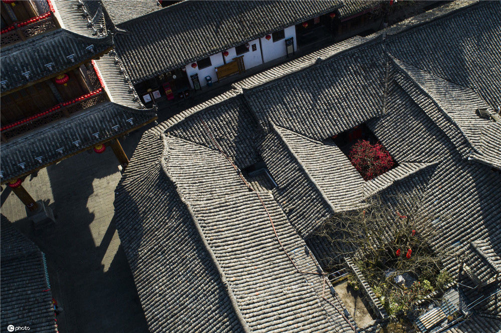 2020年2月21日,四川南充閬中古城中天樓旁,張家小院天井中的海棠在陽(yáng)光中綻放(無(wú)人機(jī)拍攝)。