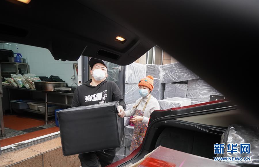 2月26日,劉女士(右)和伙計(jì)把裝滿盒飯的保溫箱搬上車。新華社記者程敏攝