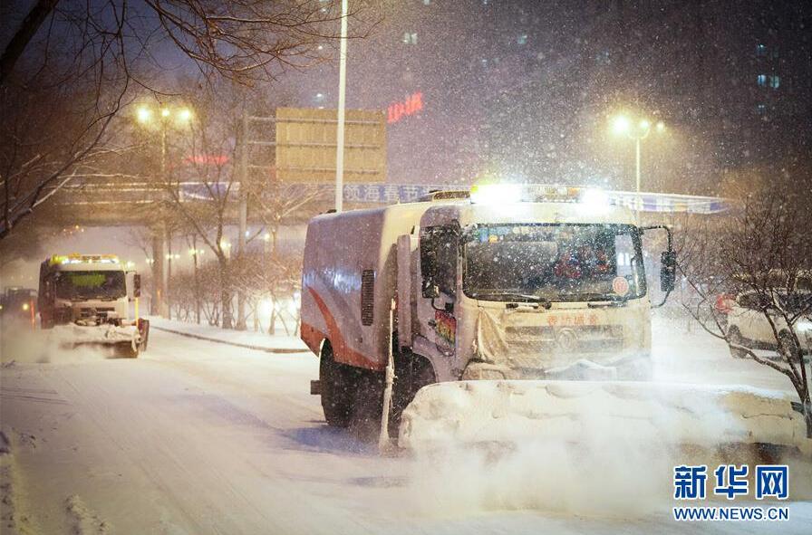 2月28日,清雪車(chē)輛在哈爾濱市的一條馬路上作業(yè)。新華社記者 王松 攝