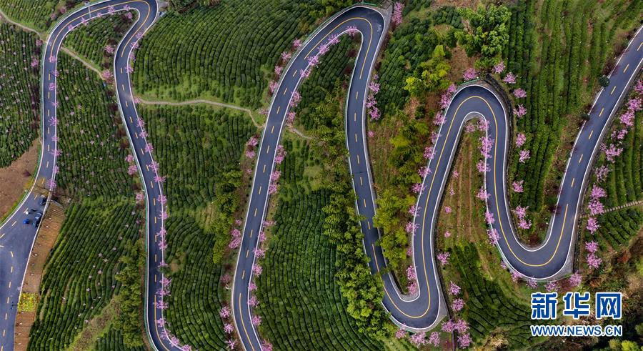 這是3月2日拍攝的平利縣長(zhǎng)安鎮(zhèn)洪福茶山,道路兩旁的春梅盛開(kāi)(無(wú)人機(jī)照片)。新華社記者陶明攝