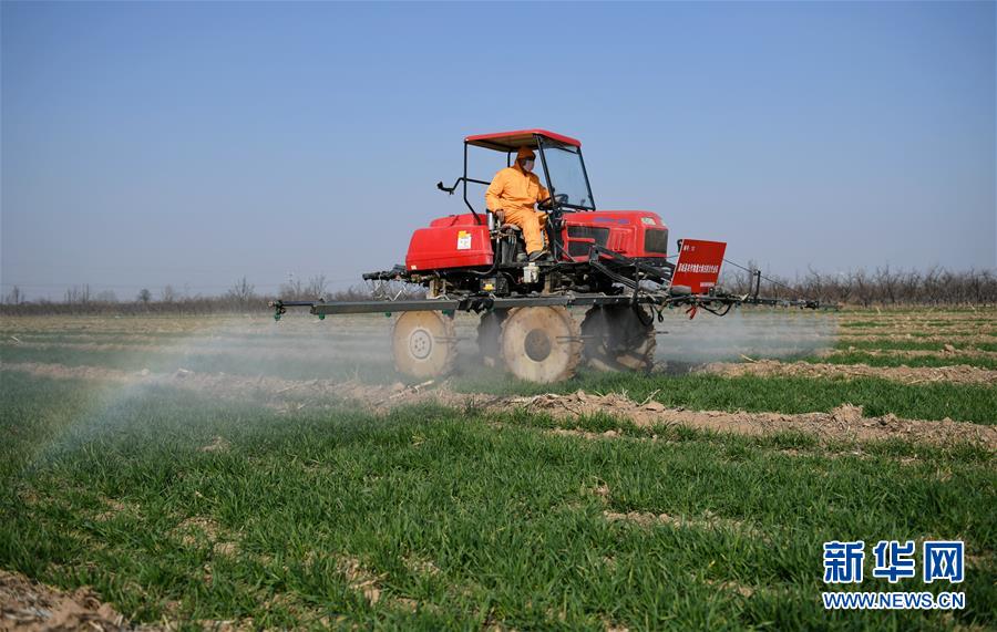 3月4日,建建農(nóng)機(jī)合作社社員在蒲城縣椿林鎮(zhèn)平峨村駕駛自走式高桿噴霧機(jī)為小麥噴灑除草殺菌劑。近日,為確保疫情期間不誤農(nóng)時(shí),陜西省蒲城縣植保植檢站組織縣內(nèi)7家農(nóng)作物病蟲害專業(yè)化防治單位,在小麥返青起身期,對(duì)麥田進(jìn)行除草及病蟲害的防控工作。新華社記者李一博攝