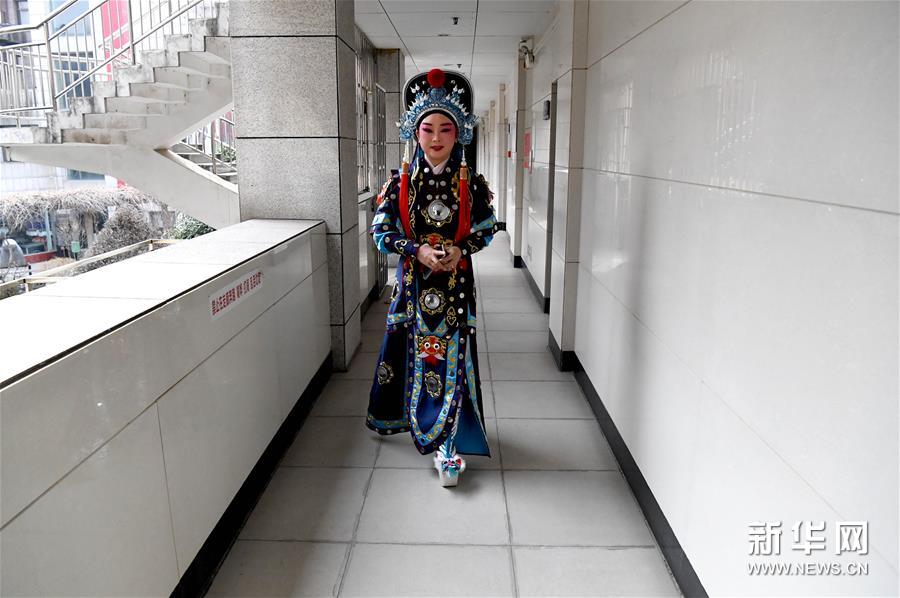3月3日,李金玲在鄭州文化館通過直播的形式進(jìn)行帶妝表演豫劇《花木蘭》選段。李金玲是鄭州工程技術(shù)學(xué)院音樂舞蹈學(xué)院的教授,也是豫劇常派弟子。14歲開始學(xué)習(xí)豫劇的她師從豫劇大師常香玉的次女陳小香。多年來,除了本職工作教學(xué)外,她還作為文化志愿者,到各地義務(wù)表演、授課,致力于豫劇的傳承與發(fā)展。疫情防控期間,鄭州文化館展開線上文藝戰(zhàn)“疫”,開通網(wǎng)絡(luò)直播平臺,李金玲也作為志愿者走進(jìn)“直播間”,進(jìn)行帶妝表演和教學(xué),精彩的“云”上表演吸引了不少戲迷的關(guān)注。“在這個特殊時期,通過直播的形式為大家表演,希望可以讓更多的人喜歡和了解豫劇,感受它獨特的魅力?!崩罱鹆嵴f。新華社記者 李安 攝