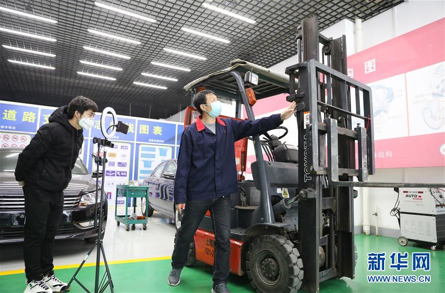 3月4日,職教城內(nèi)的鞍山市交通運輸學(xué)校的楊永祥老師(右)為學(xué)生進行物流叉車實訓(xùn)網(wǎng)絡(luò)授課。遼寧省鞍山市職教城內(nèi)的各類職業(yè)教育學(xué)校從3月2日恢復(fù)網(wǎng)絡(luò)授課以來,教師們設(shè)置了豐富多彩的課程,提高1萬余名學(xué)生線上學(xué)習(xí)的積極性。新華社記者 姚劍鋒 攝