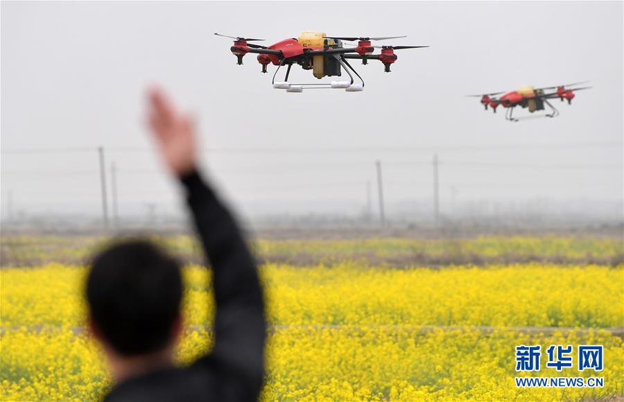 無人機(jī)在江西省南昌市南昌縣蔣巷鎮(zhèn)對(duì)油菜田進(jìn)行植保作業(yè)(2月28日攝)。新華社記者 彭昭之 攝
