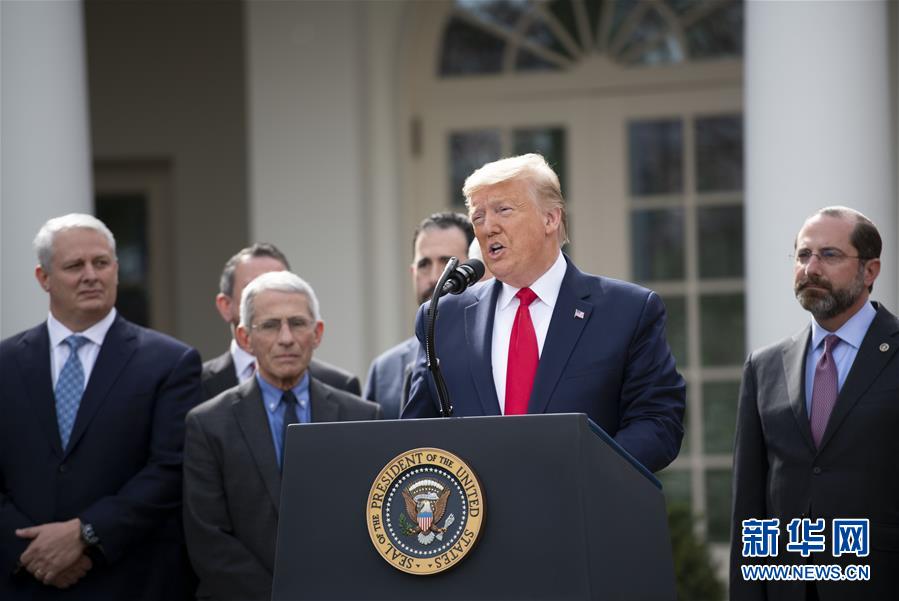 3月13日,美國總統(tǒng)特朗普(前)在華盛頓白宮的記者會上講話。特朗普當(dāng)天下午在白宮發(fā)表講話時(shí)正式宣布“國家緊急狀態(tài)”。他說,此舉旨在讓美國聯(lián)邦政府全力投入到抗擊新冠肺炎疫情的努力中。這項(xiàng)舉措將釋放500億美元資金,幫助各州和地方政府應(yīng)對疫情。新華社記者劉杰攝
