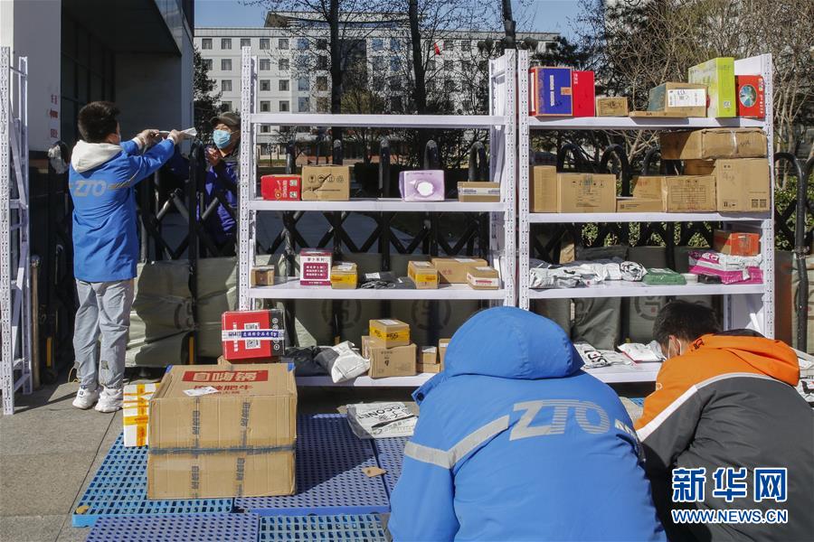 3月12日,李杰(左一)在中國青年政治學院快遞點隔著柵欄給客戶遞送包裹。新華社記者張玉薇攝