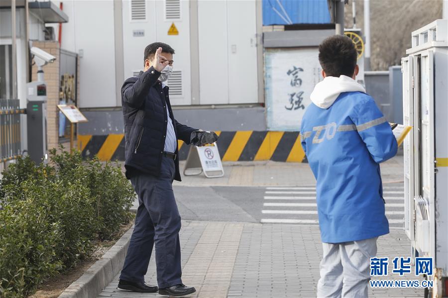 3月12日,李杰在中通快遞北京廠洼路網(wǎng)點上崗前檢測體溫。新華社記者張玉薇攝