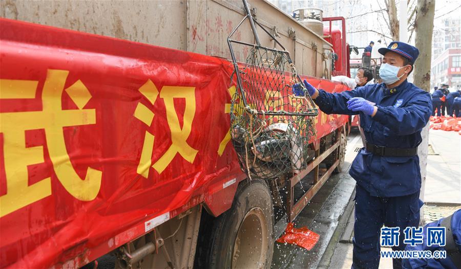 3月13日,一批運到武漢市硚口區(qū)華生漢口城市廣場社區(qū)的活魚正在卸貨。當日,首批100噸調配自湖北省咸寧市的活魚運抵武漢市硚口區(qū)11個街道下轄社區(qū)。咸寧是魚米之鄉(xiāng),水產資源豐富。此次戰(zhàn)疫咸寧得到了全國人民的支持,疫情得到良好控制。咸寧送魚,希望傳遞愛心,支持武漢早日戰(zhàn)勝疫情。新華社記者程敏攝
