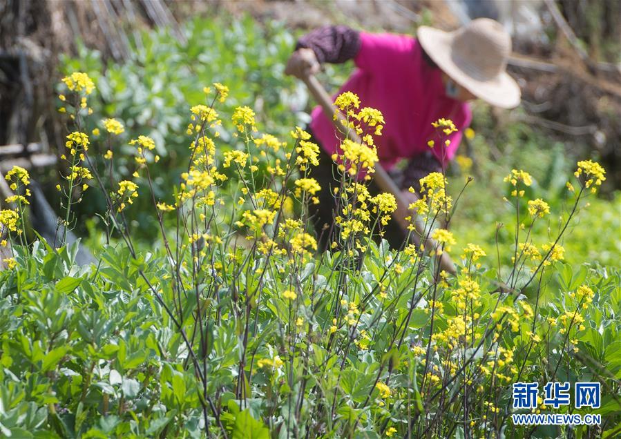 3月14日,在武漢市西北部市郊,一名市民在油菜花田間勞作。隨著氣溫升高,春意在武漢的枝頭上萌動(dòng),花朵漸次開放。新華社記者肖藝九攝