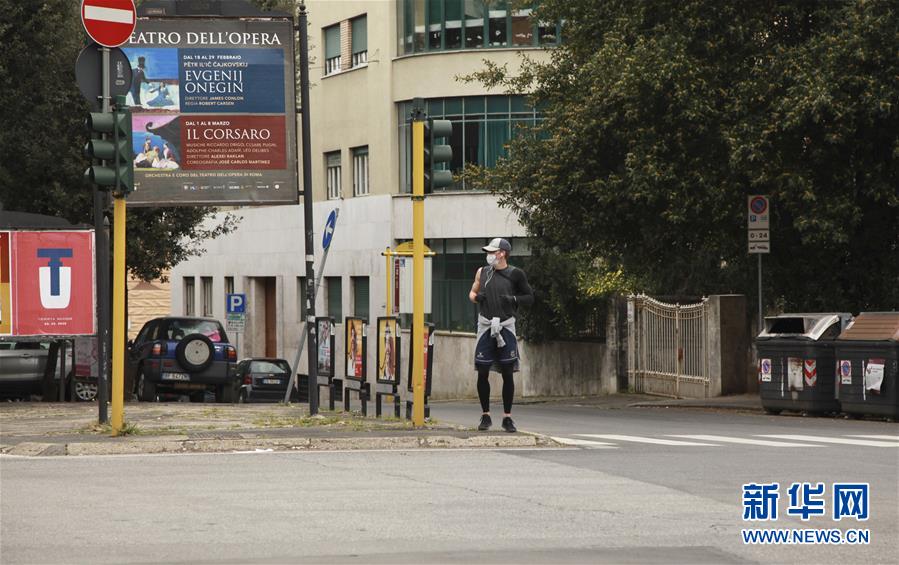3月14日,在意大利首都羅馬,一名男子戴著口罩跑步。新華社記者劉詠秋攝