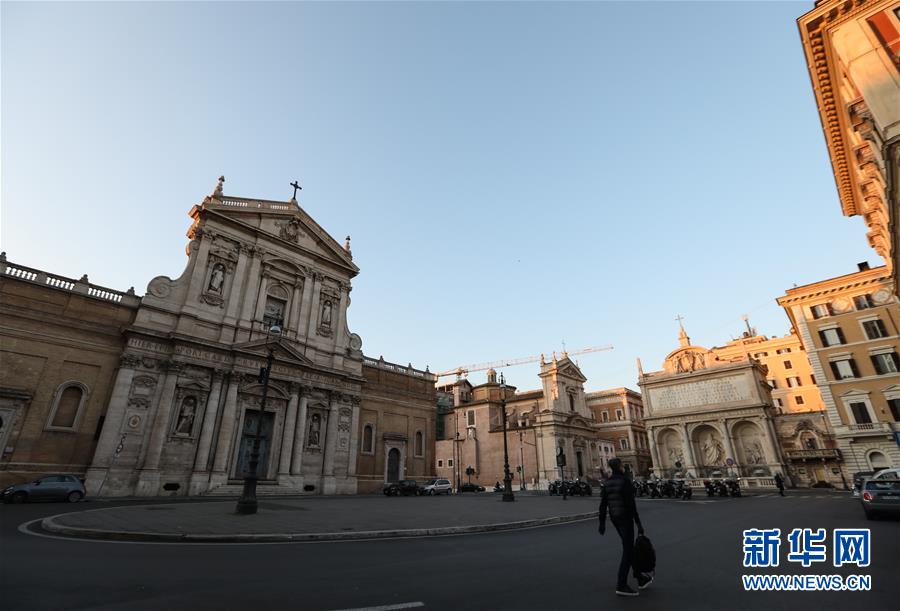 3月16日,在意大利首都羅馬,一名男子戴著口罩走過廣場。新華社記者程婷婷攝