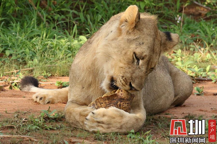 肯尼亞獅子捉了只烏龜當(dāng)“零食” 啃不到肉肉好生氣!