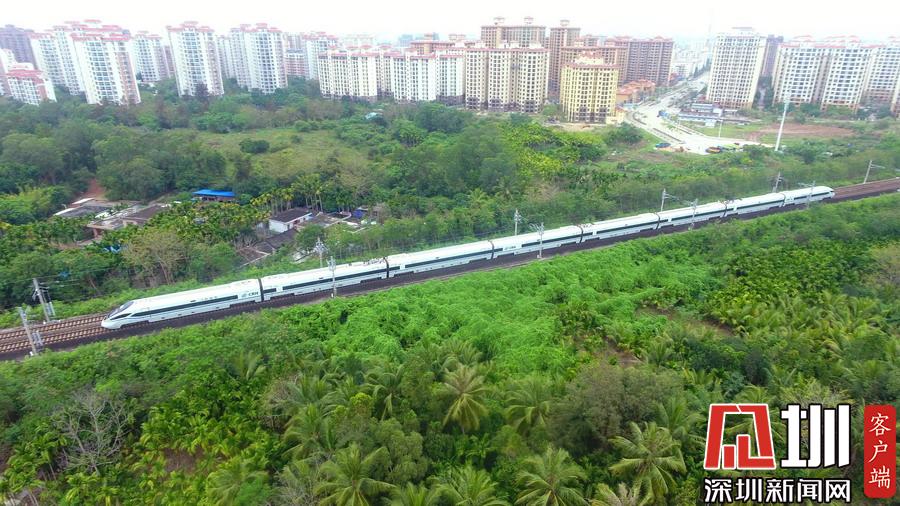 2020年3月17日,海南環(huán)島鐵路一列動車從春光明媚的瓊海城區(qū)經(jīng)過。