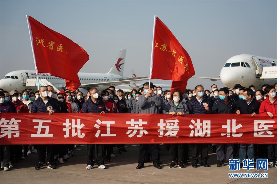 3月17日,在江蘇南京祿口國際機(jī)場,醫(yī)療隊隊員參加歡迎儀式。新華社記者季春鵬攝